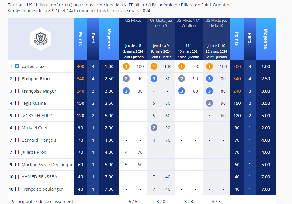 Résultats tournoi US (billard américain) - Académie Billard Saint Quentin - MArs 2024