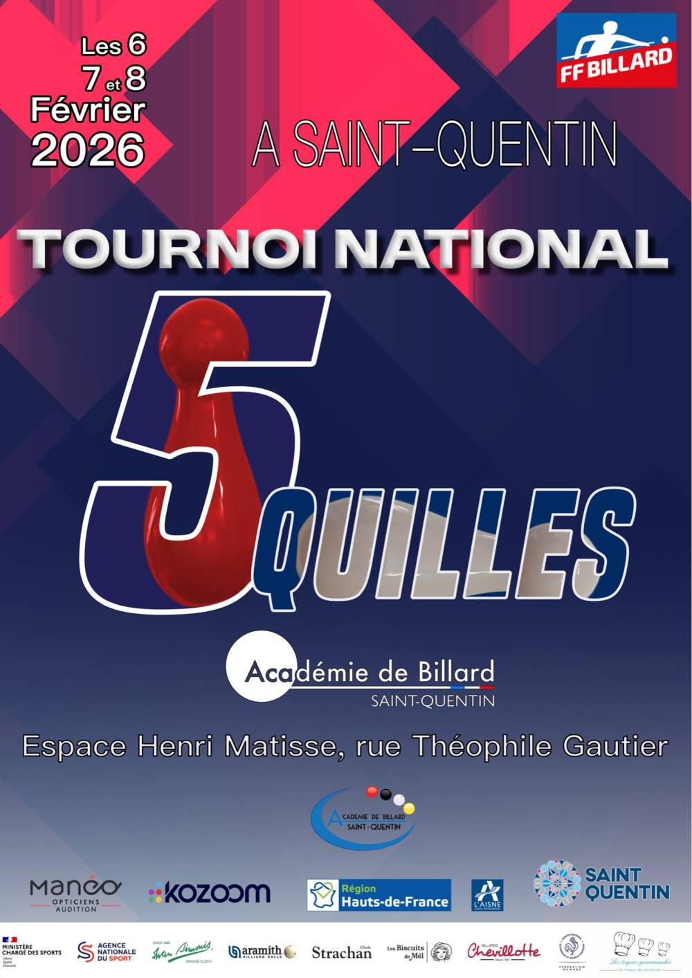 L’Académie de Billard de Saint-Quentin est heureuse d’accueillir, les 6, 7 et 8 février 2026, le quatrième tournoi national de billard cinq quilles.