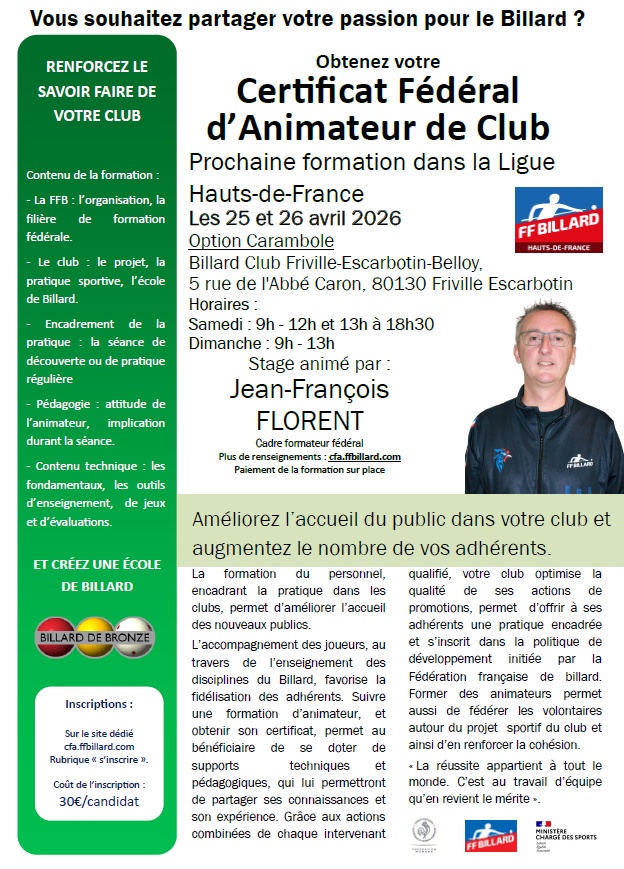 Certificat Fédéral d’Animateur de Club - Formation en Ligue des Hauts de France - 25 & 26 Avril 2026